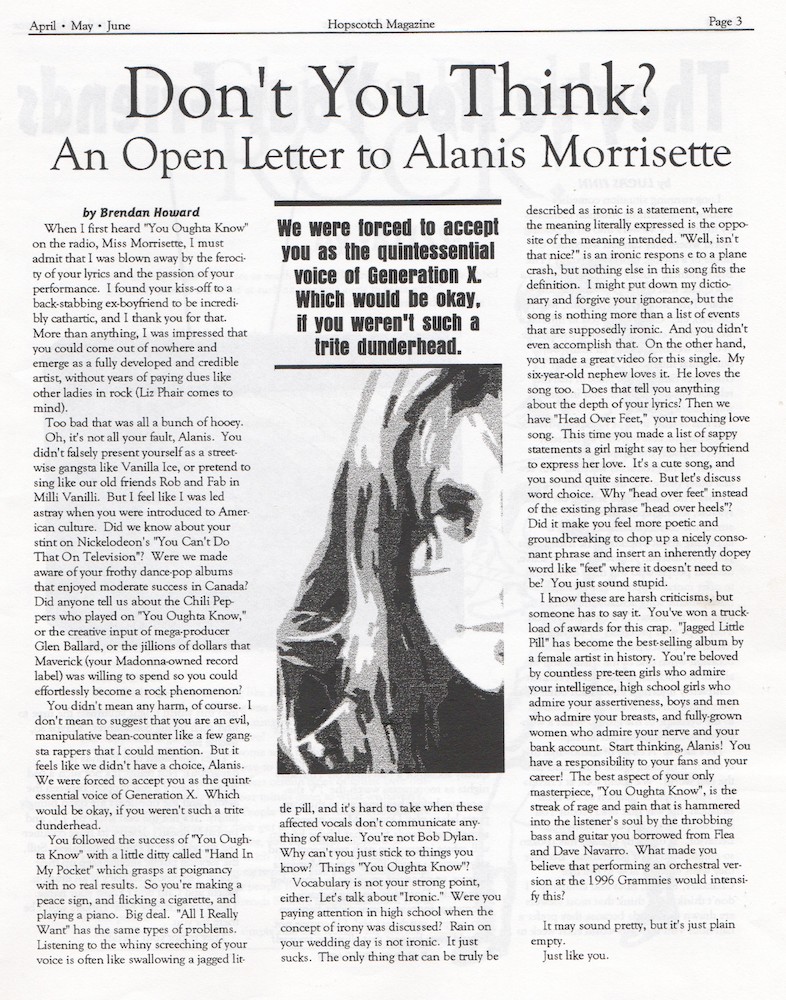 You didn't mean any harm, of course. I don't mean to suggest that you are an evil, manipulative bean-counter like a few gangsta rappers that I could mention. But it feels like we didn't have a choice, Alanis. We were forced to accept you as the quintessential voice of Generation X. Which would be okay, if you weren't such a trite dunderhead.